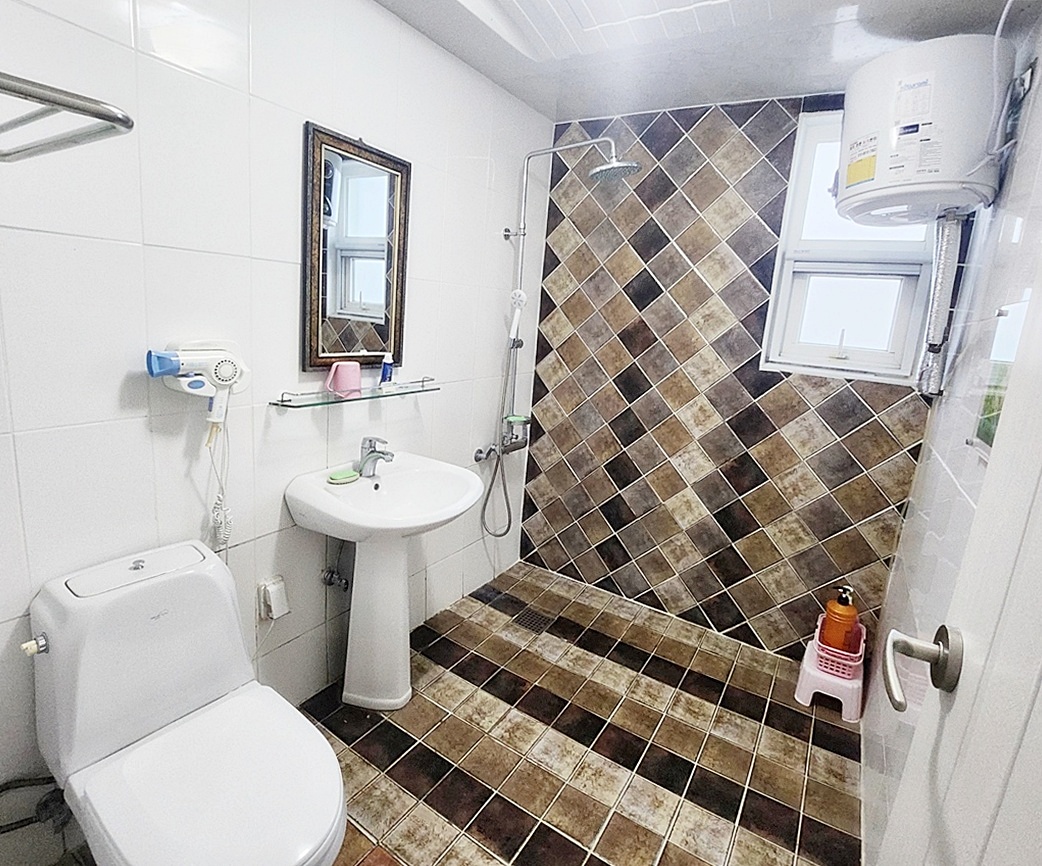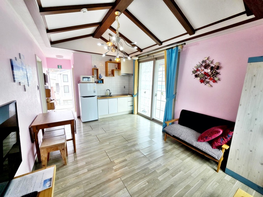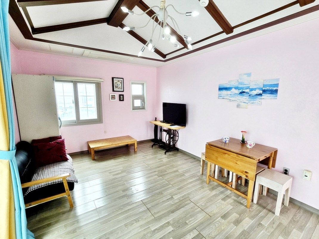 42인치 TV, 쿡(Qook)티비, 무선인터넷, 스피커, 냉장고, 천정형 에어컨, 침대, 식탁, 전자렌지, 전기밥솥, 무선주전자, 후라이팬, 남비, 와인잔,